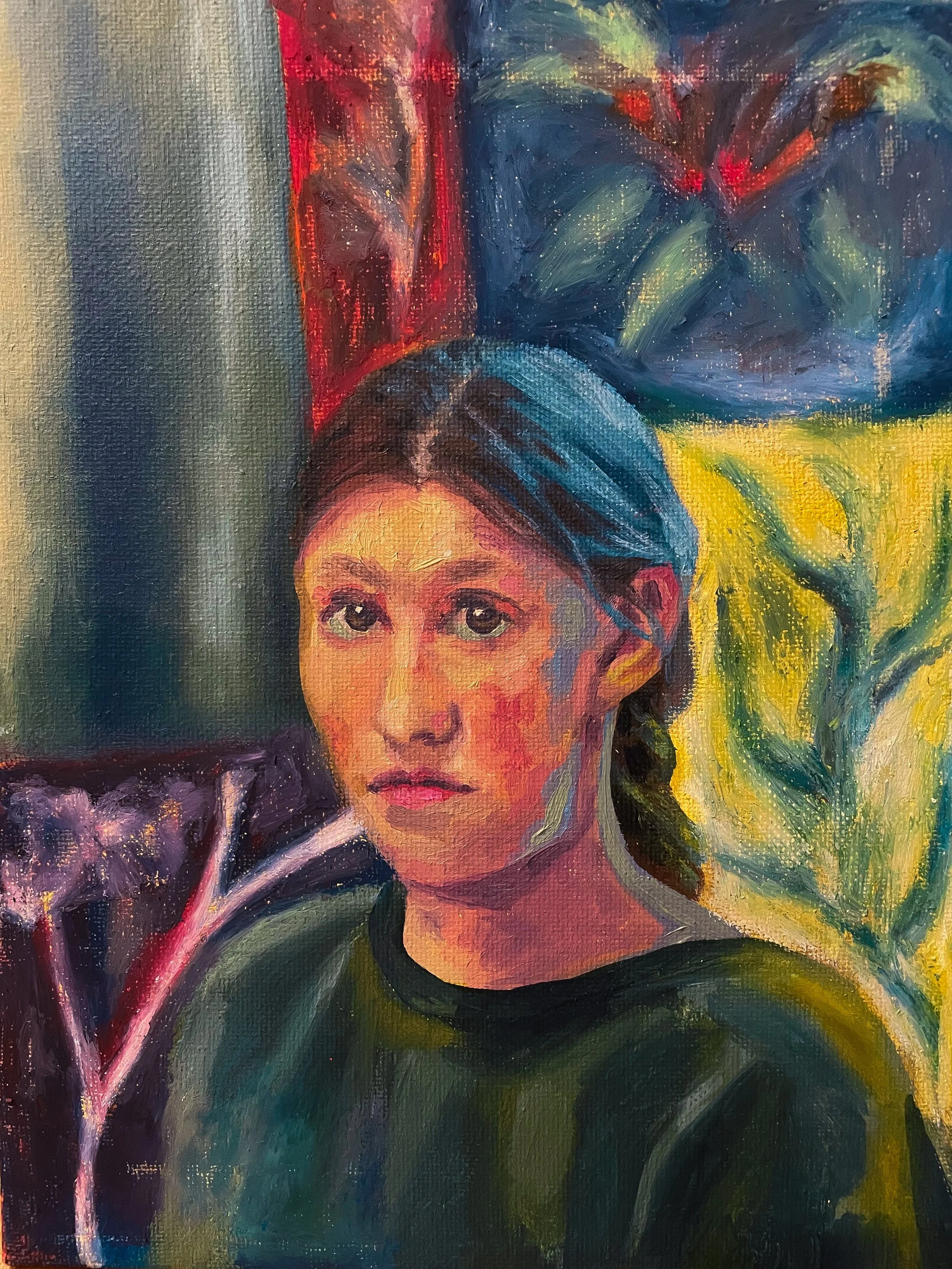 “Self Portrait 2” was the last piece I worked on before commencing a brief hiatus from painting. I returned to the work in 2025 and completed it within a few hours, breaking down the realism of the piece through the use of more vivid colours and experimental marks with oil pastel. This piece is significant to me not only as an expression of myself but also as a symbol of my work and it’s regenerative nature.